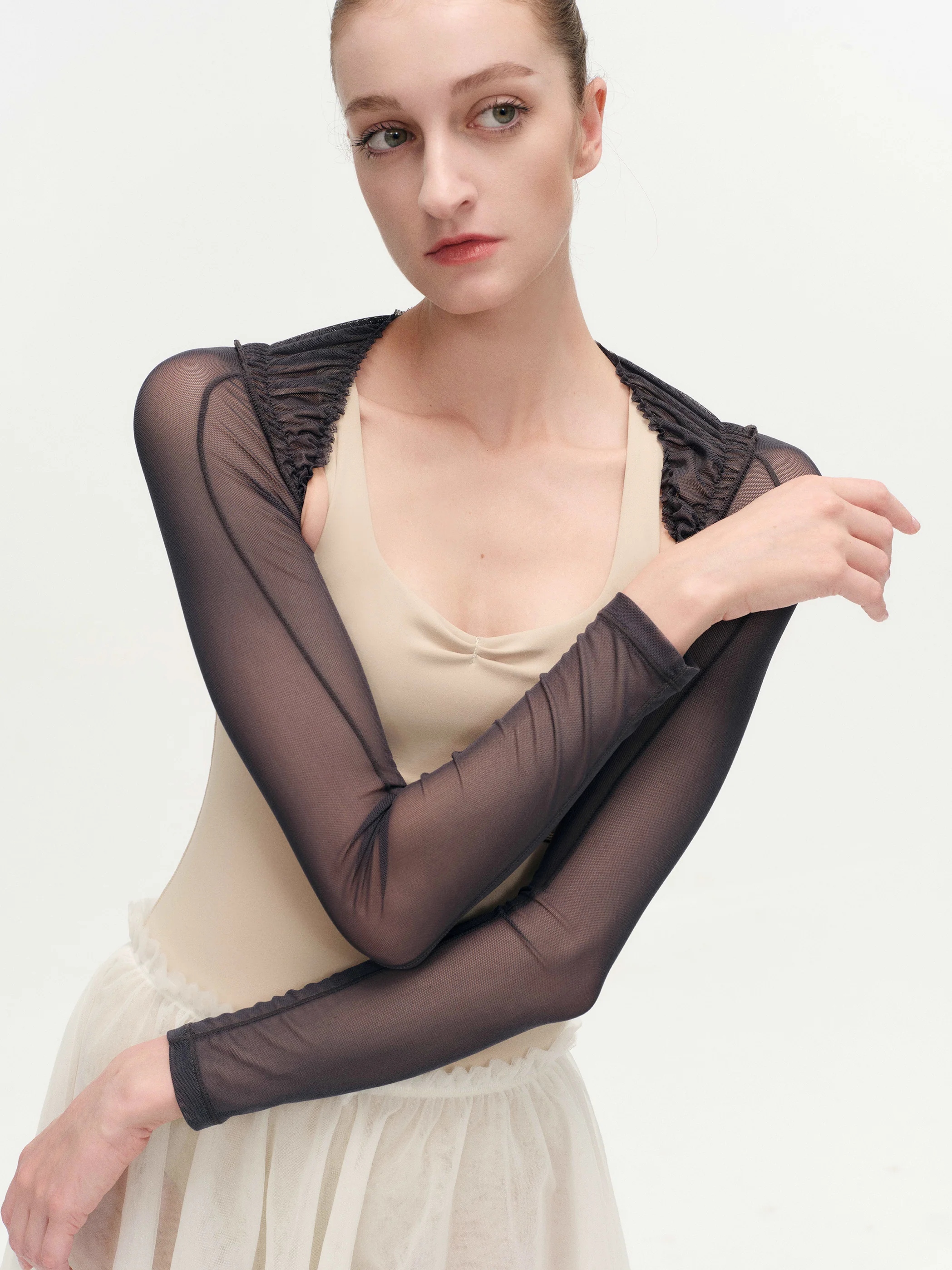 - Delicate, stretchy mesh wraps the arms gracefully, enhancing the natural contours.