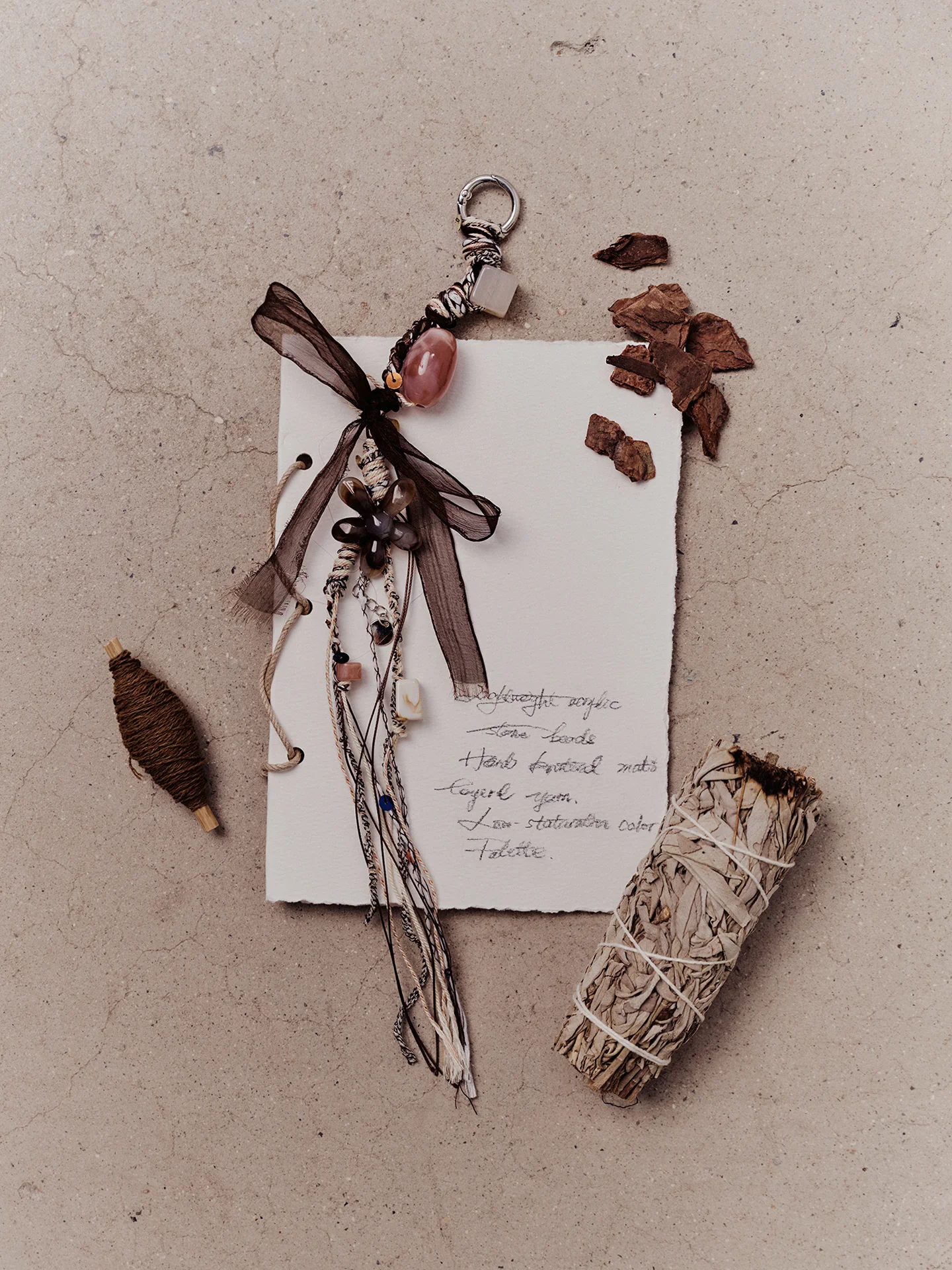 - Handwoven drawstrings featuring multi-level pairing of suede/waxed cord/cotton thread.